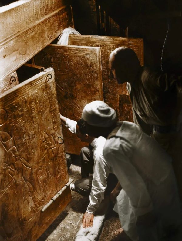 Говард Картер рядом с саркофагом Тутанхамона. Фото: октябрь 1925 г. Image: Harry Burton/Griffith Institute, University of Oxford, colourized by Dynamichrome